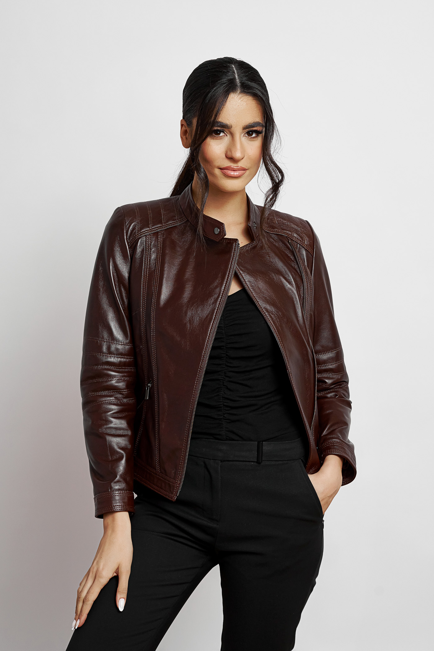 Δερμάτινο μπουφάν καφέ μεσάτο σταυρωτό με όρθιο γιακά