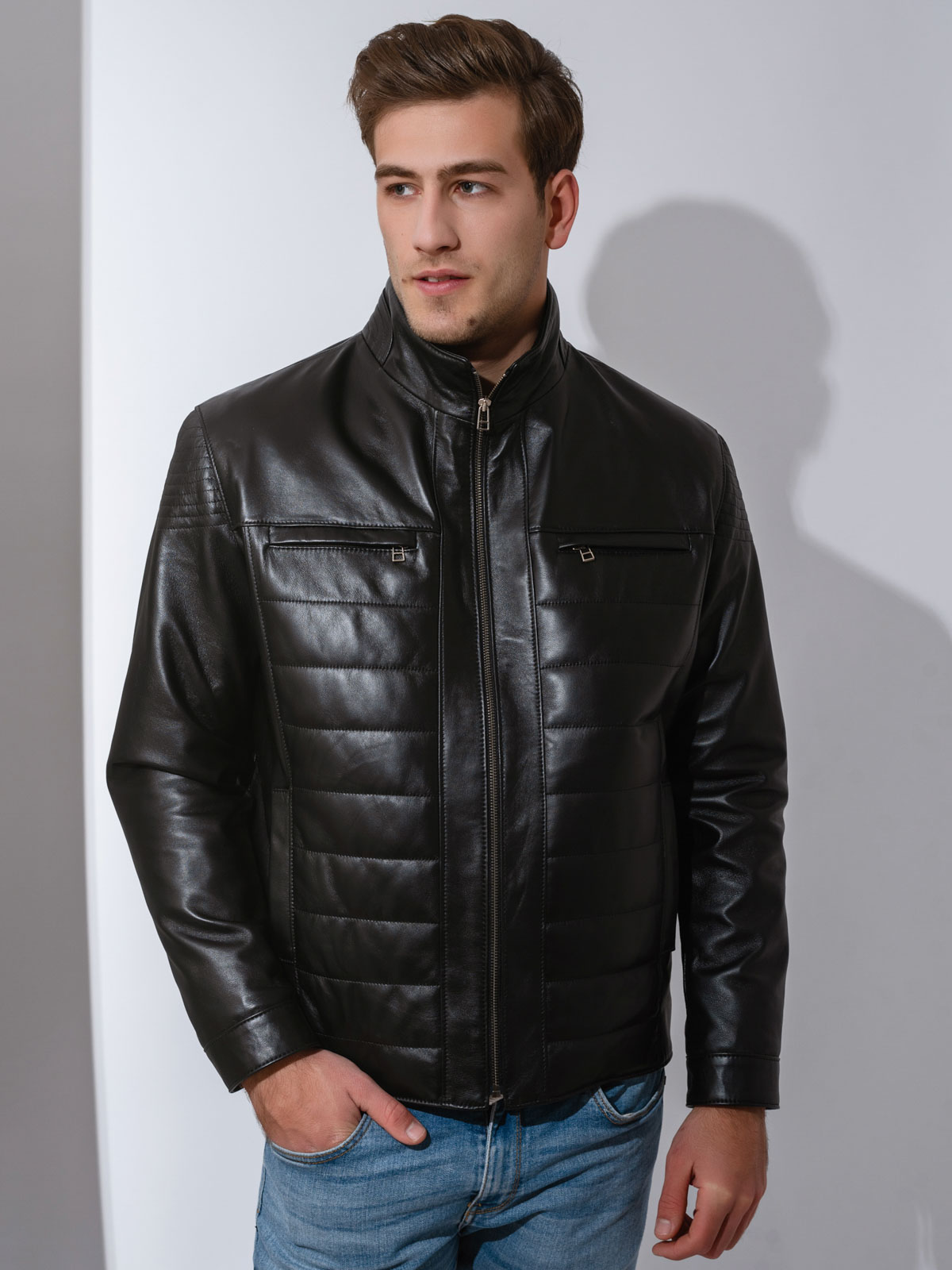 Ανδρικό δερμάτινο μπουφάν φουσκωτό μαύρο με οριζόντιες ανάγλυφες ραφές.
